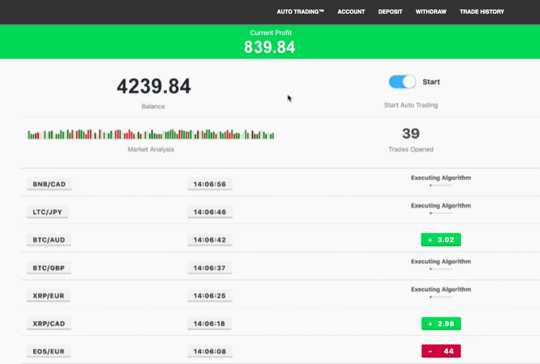 بعد دقائق قليلة من تفعيل الحساب، تحققتُ من حسابي ووجدتُ ربحًا قدره 839.84 درهمًا إماراتيًا. وقد أنجزت الخوارزمية عدة صفقات بالفعل، مما يُثبت فعالية المنصة.
